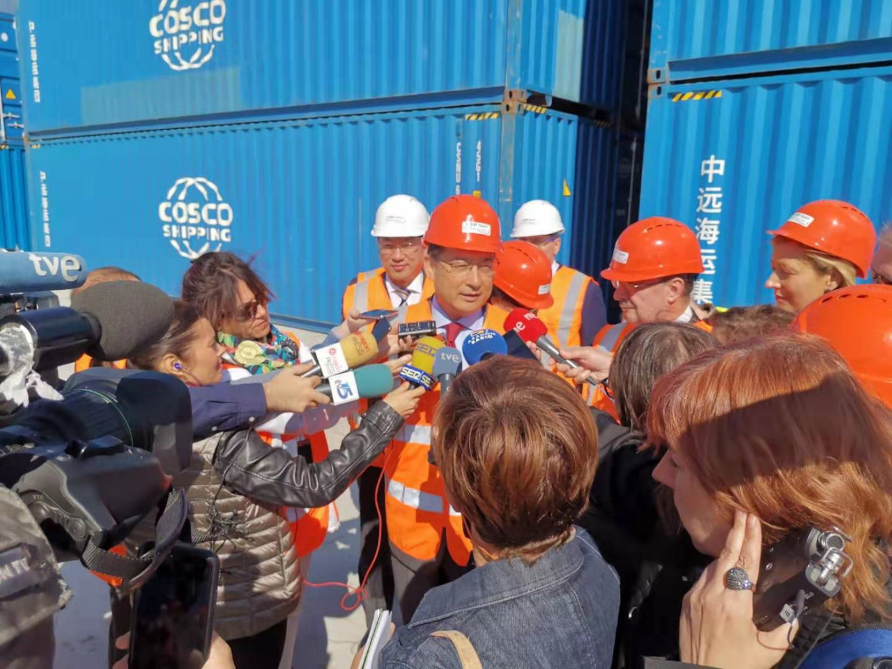 随后,孙凯陪同吕凡大使、Lambán主席和Gastón部长来到CSP萨拉戈萨铁路场站“一带一路”营销活动现场,他先向与会嘉宾详细介绍了近年来中远海运集团和中远海运港口公司为落实国家“一带一路”倡议采取的重要措施以及中远海运港口公司做为全球第一大港口运营商从2017年11月接管 CSP西班牙码头的经营情况。2018年,CSP西班牙码头通过调整公司管理架构、加大市场营销、加强成本控制、细化管理制度、优化操作流程有效手段,全年操作箱量达到362.2万TEU,比2017年同比提高12%,效益大幅提升。进入2019年,公司保持良好发展势头,特别是在今年4月和5月连续创造创造了自2001年公司成立以来单月最高箱量纪录,单月操作量达到了342,239 TEU,直接为西班牙当地提供了1200多个工作岗位 。