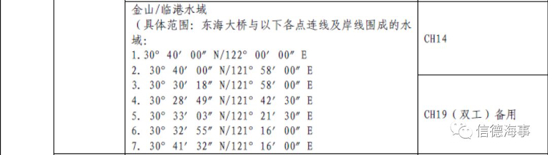 洋山深水港区及周边水域:CH13频道,CH79频道(双工)备用。