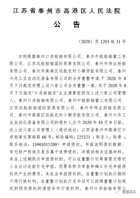 泰州口岸船舶有限公司、泰州中航船舶重工有限公司、江苏远航船舶国际贸易有限公司、泰州市伟业拆船有限公司、泰州市高港区远航农村小额贷款有限公司、泰州兴舟工业自动化装备有限公司的债权人应于 2020年 10月9日前, 向上述六家公司管理人(通讯地址:江苏省泰州市高港区口岸街道龙窝南路 66号;邮政编码:225321;联系人:陆青 ;联系电话:13961015209)申报债权,书面说明债权数额、有无财产担保及是否属于连带债权,并提供相关证据材料。未在上述期限内申报债权的,可以在重整计划草案提交债权人会议讨论前补充申报,但要承担为审查和确认补充申报债权所产生的费用。未依法申报债权的,在重整计划执行期间不得行使权利,在重整计划执行完毕后可以按照重整计划规定的同类债权的清偿条件行使权利。泰州口岸船舶有限公司、泰州中航船舶重工有限公司、江苏远航船舶国际贸易有限公司、泰州市伟业拆船有限公司、泰州市高港区远航农村小额贷款有限公司、泰州兴舟工业自动化装备有限公司的债务人或者财产持有人应当向上述六家公司管理人清偿债务 或交付财产。
