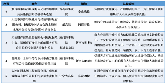 再看当前司法实践中的主要观点,做了案例检索和分析。其中,2005年油轮阿提哥轮污染事故。大连市海洋与渔业局要求船东及其互保协会承担连带责任,最高院民事裁定书中(2015)民申字第1637号意见:由于油污公约并未明确规定船舶所有人与油污损害责任保险人或者提供财务保证的其他人对船舶油污损害承担连带责任,依据连带责任法定原则,海洋渔业局关于保赔协会应承担连带责任的主张没有法律依据。同样的司法观点在其他案例中也可见,其中,第三个案例中认定为不真正连带责任,由于这种责任形式主要是理论探讨,不再展开。