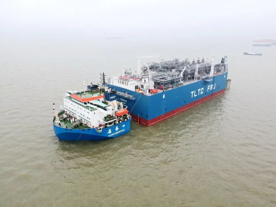 “康盛口”轮全员就位,装货作业正式开始。江面风平浪静,远处大型LNG海上浮式再气化单元“TORMAN”在4艘拖轮的拖带下缓缓驶来。9时50分,“康盛口”轮下潜到装货吃水,一切正常。