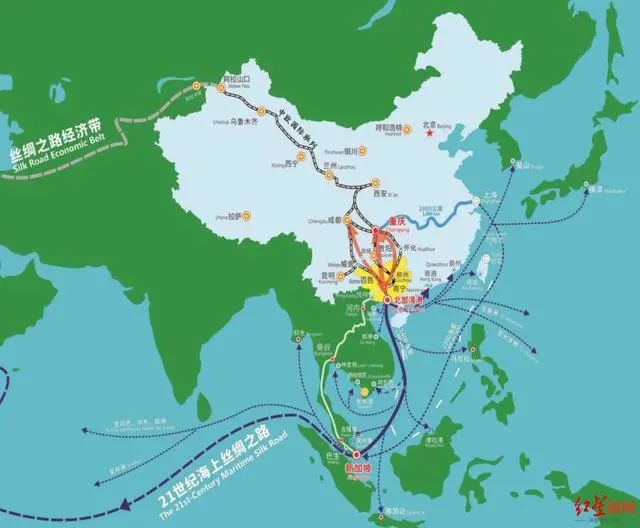 西部陆海新通道以重庆为运营中心,以广西、贵州、甘肃、青海、新疆等西部省份为关键节点,利用铁路、海运、公路等运输方式,向南经广西北部湾通达世界各地,比经东部地区出海所需时间大幅缩短。