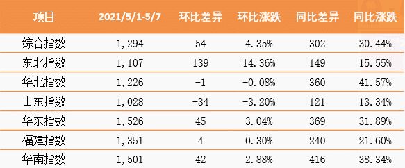此外,山东指数报收1028点,环比下降34点,降幅3.2%,同比上升121点,增幅13.34%;华东指数报收1526点,环比上升45点,增幅3.04%,同比上升369点,增幅31.89%;福建指数报收1351点,环比上升4点,增幅0.3%,同比上升240点,增幅21.6%。