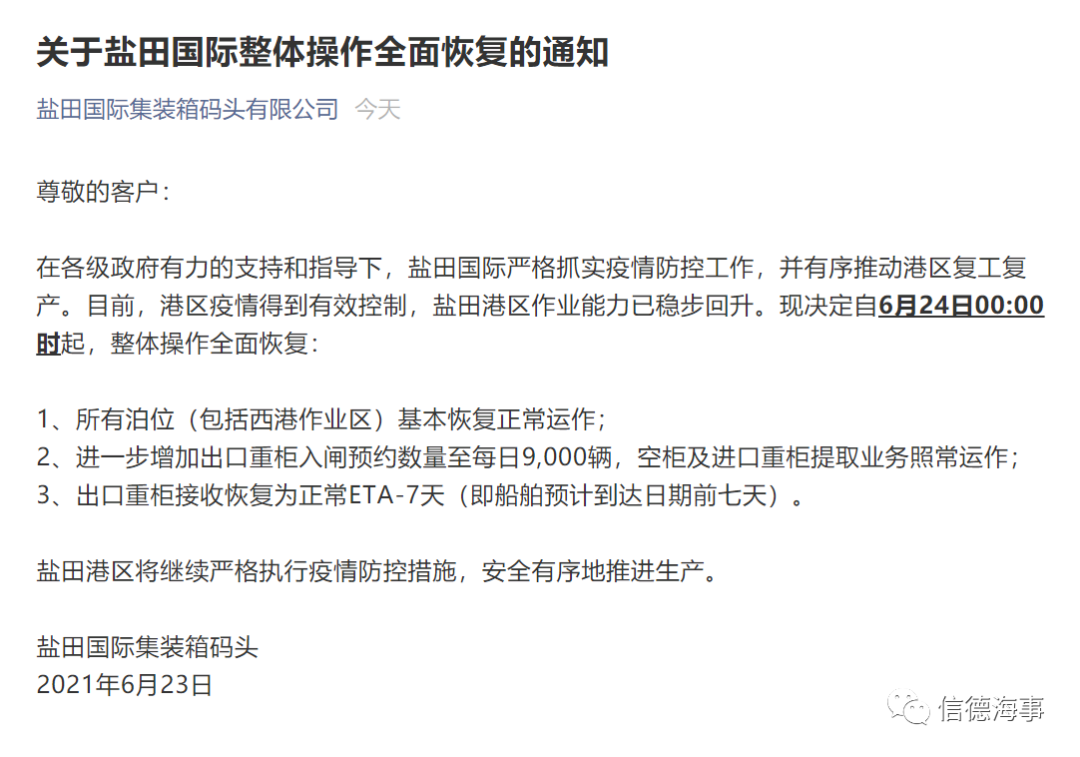 今天(6月23日),盐田国际集装箱码头有限公司发布通告介绍到,在各级政府有力的支持和指导下,盐田国际严格抓实疫情防控工作,并有序推动港区复工复产。目前,港区疫情得到有效控制,盐田港区作业能力已稳步回升。现决定自6月24日00:00时起,整体操作全面恢复: