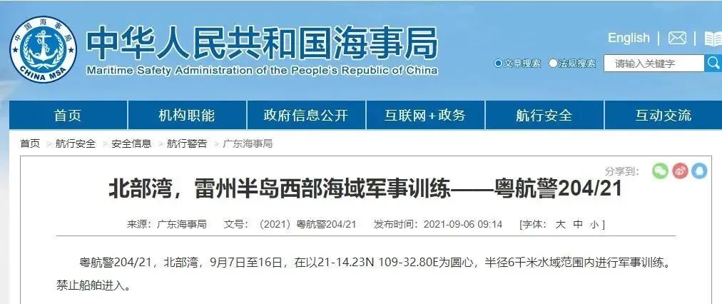 以21-14.23N 109-32.80E为圆心,半径6千米水域范围内进行军事训练。