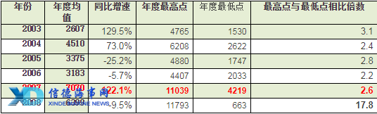 表四 2003-2008年BDI指数年度均值及最高点、最低点及两者之间对比表