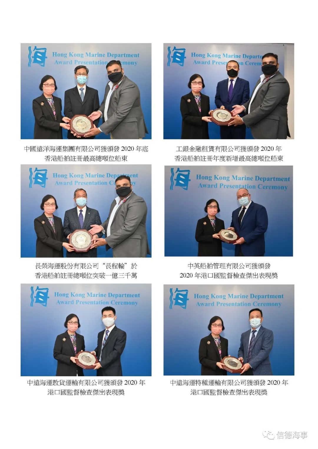 此外,鉴于2019冠状病毒病疫情为海员带来前所未有的挑战,香港海事处今年特别设立“海员战疫”奖,以表扬前线海员在严峻疫情下持续不懈维持海运服务,并表现突出。