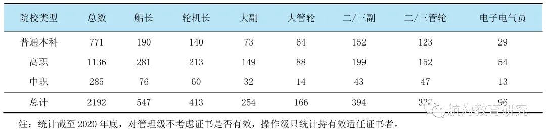 ①本报告中:“航海院校”是指经教育主管部门批准设立,取得海船三副、三管轮、电子电气员培训许可,且设置全日制航海类专业的普通本科院校、高等职业学校和中等职业学校;“航海类专业”又称“海上专业”,是指以培养海船高级船员(或培养符合操作级海员适任标准的高级航海人才)为目标的全日制普通本科、高职和中职专业,包括航海技术、轮机工程和电子电气三个专业,不包括其他非全日制教育及非学历教育的船员培训班。