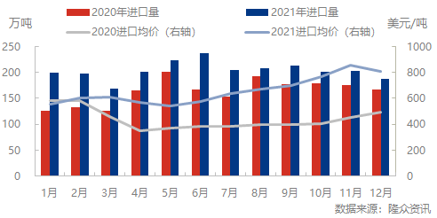 2020-2021年中国液化气进口量及进口均价趋势变化图