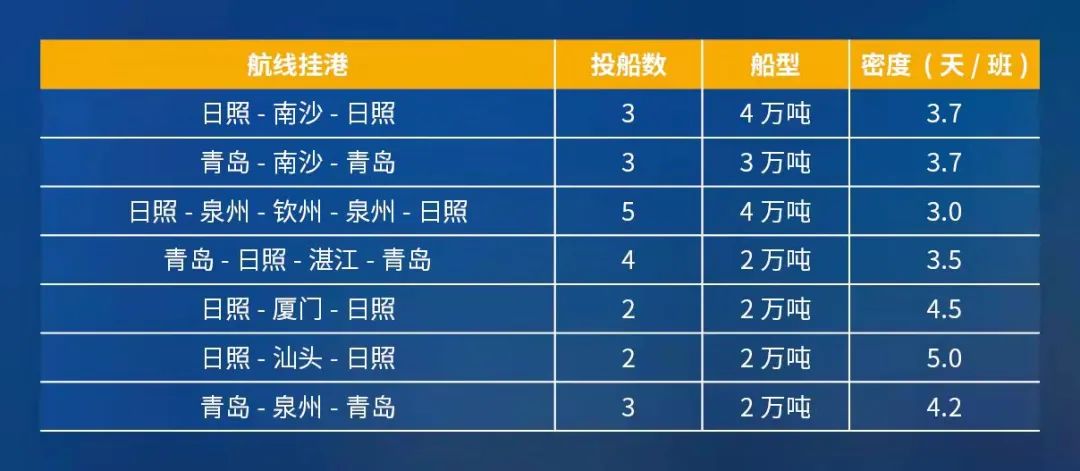 7组航线,投入22艘船舶,总运力58万吨