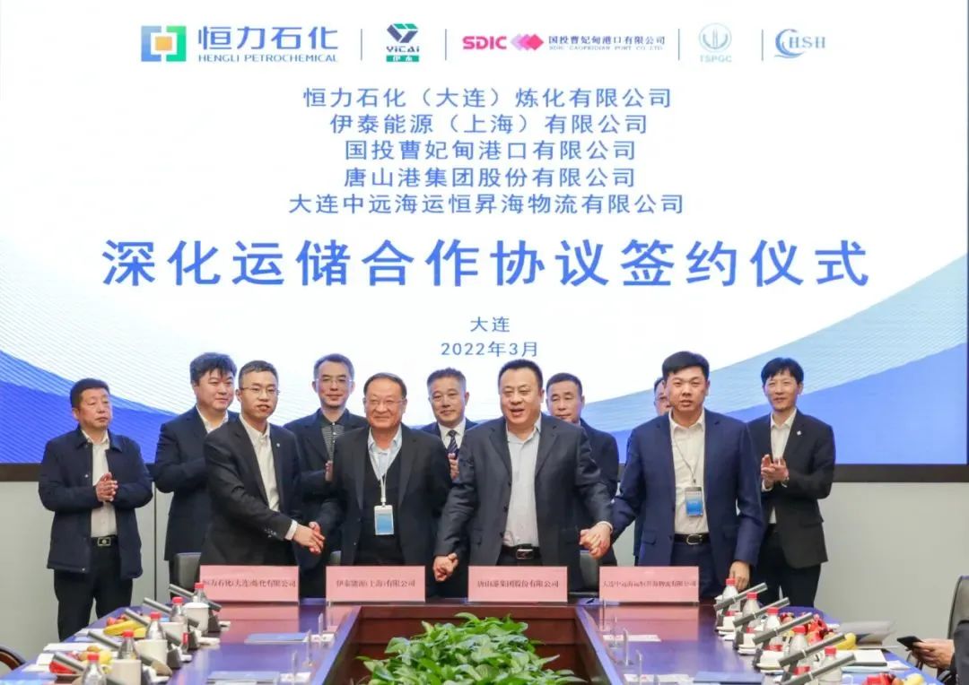 恒力(大连长兴岛)产业园与伊泰能源(上海)有限公司、国投曹妃甸港口有限公司、唐山港集团股份有限公司、中远海运物流供应链大连分公司所属大连中远海运恒昇海物流有限公司,共同签署深化运储合作协议,畅通能源保供,供应链现代化水平再上新台阶。