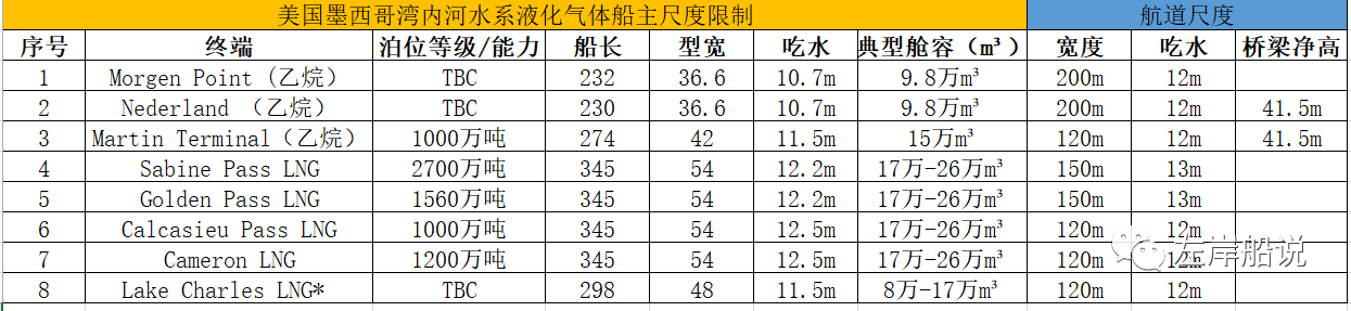 (2)液化气体船尺寸:墨西哥湾内河水系的液化气体船标准化程度高,尺寸大。如休斯顿水道的通航技术标准:“休斯顿航道主尺度包络线”,即230米(船舶总长LOA)×36.6米(型宽),代表船型为83000m³VLGC到最新的江南99000m³VLEC。萨宾-内奇斯河水道的船型尺寸大于休斯顿水道,LNG船的主流船型为17万方级别,最大可兼容Q-Max级26万立方米(345m×54m),上游的Martin/Nederland乙烷终端目前主流船型为99000m³(兼容休斯顿水道船型),AEC乙烷终端Martin Terminal运营后最大尺寸到15万立方级别,对应的超大型乙烷船ULEC主尺度为274米×42米。