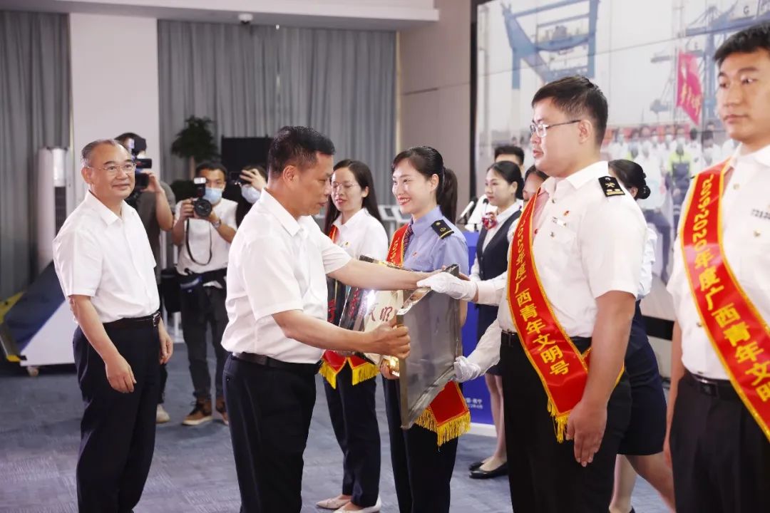 西部陆海新通道的建设和发展,离不开青年人的奋发进取、开拓创新、努力拼搏。与会嘉宾对2021年广西重大项目青年突击队建功竞赛一等奖队伍代表和荣获2019-2020年度广西青年文明号集体的代表进行颁奖和授牌。