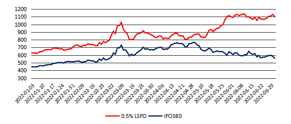 上周新加坡高硫380cst燃料油均价584.8美元/吨,较前一周均价上涨7.2美元/吨,0.5%低硫燃料油均价1105美元/吨,较前一周均价上涨36美元/吨。
