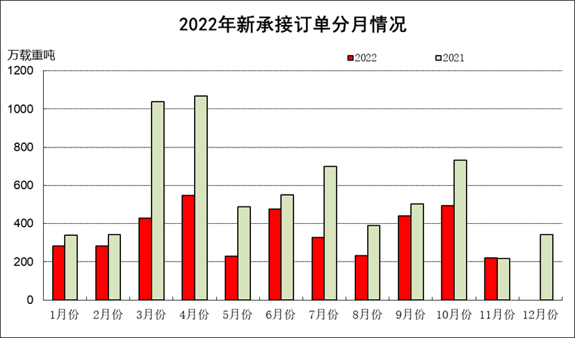 1~11月,50家重点监测造船企业造船完工3203万载重吨,同比下降8.9%。承接新船订单3720万载重吨,同比下降40.2%。11月底,手持船舶订单10054万载重吨,同比增长6.1%。