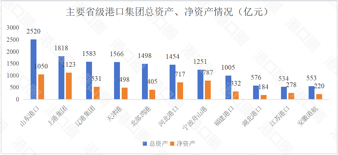 图表2:主要省级港口集团2022年总资产、净资产情况(亿元)
