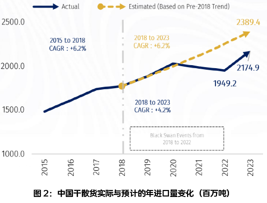 我们可以观察到,从2015年至2018年,中国干散货进口的复合年增长率(CAGR)较高,为6.2%;从2018年到2023年,CAGR下滑至4.2%。