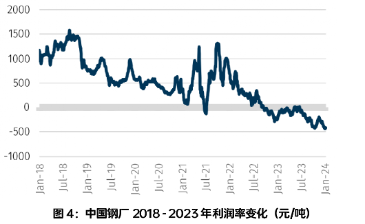 然而,BRS分析师表示,“我们认为,现在下结论还为时过早。按照同样的逻辑,如果中国房地产市场一直在上涨并蓬勃发展,那么中国钢铁的健康利润率应该会刺激钢厂增加产量,以实现更高的盈利。然而,众所周知,自2021年末至2022年初以来,房地产行业下滑以来,中国钢厂的利润率是有所下降的(见图4)。所以说我们认为“”干散货市场可能与中国房地产市场关联性已经不强的”这一观点是有待考证的。“