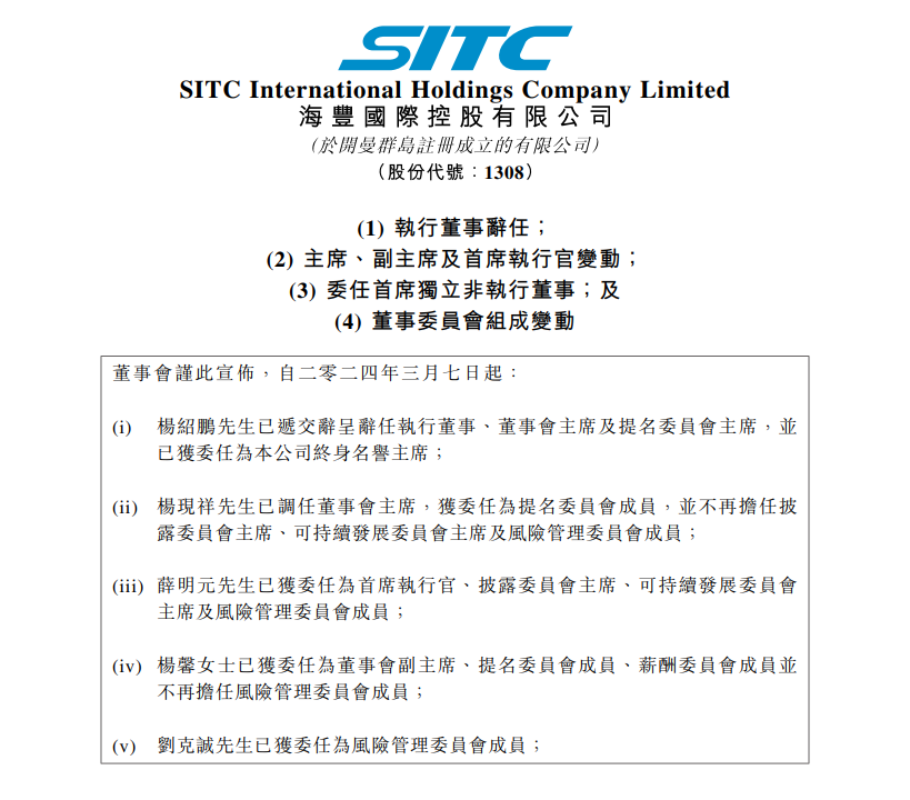 海丰国际(01308)近日发布最新公告宣布高层管理团队重大调整,杨现祥接任董事会主席,薛明元成为新任首席执行官。杨绍鹏辞职并获委任为公司终身名誉主席。