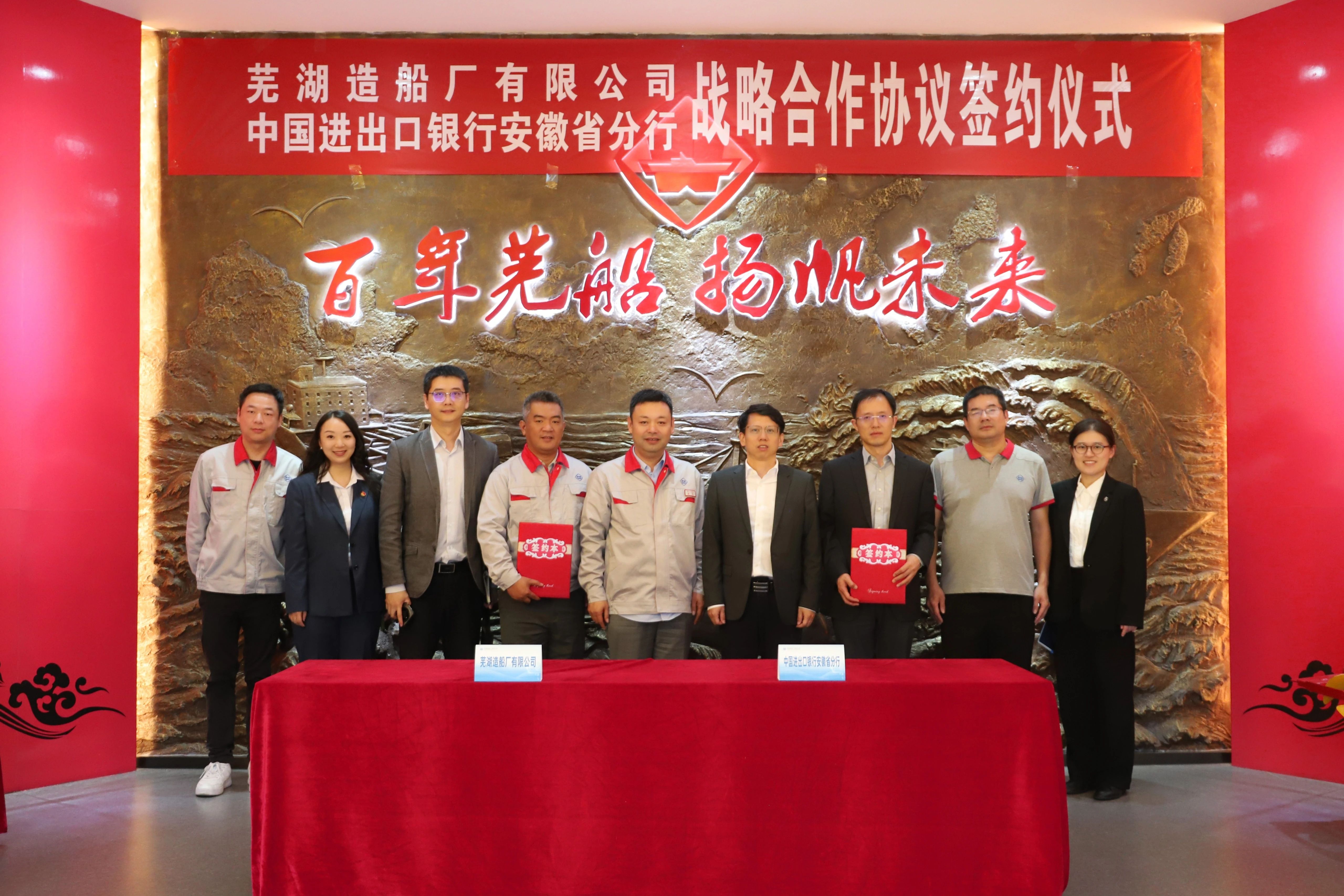 10月17日,芜湖造船厂与进出口银行安徽省分行在芜湖签署战略合作协议。公司党委书记、董事长张钊与进出口银行安徽省分行党委书记、行长蔡俊锋举行工作会谈并见证战略合作签署。芜湖造船厂副总经理与进出口银行安徽省分行党委委员、副行长余荣波代表双方签约。