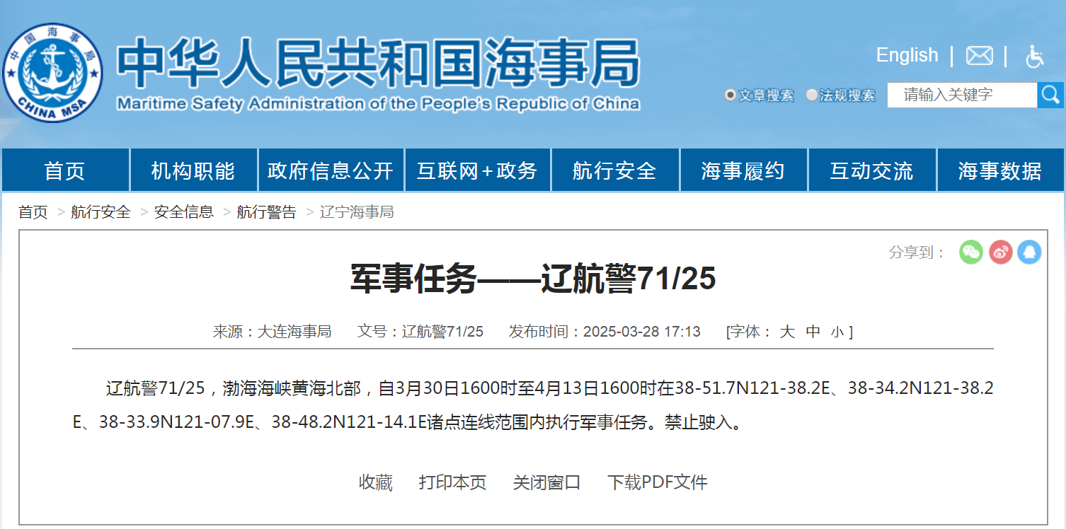 据中国海事局网站消息,大连海事局发布航行警告,3月30日16时至4月13日16时,渤海海峡黄海北部部分海域执行军事任务,禁止驶入。