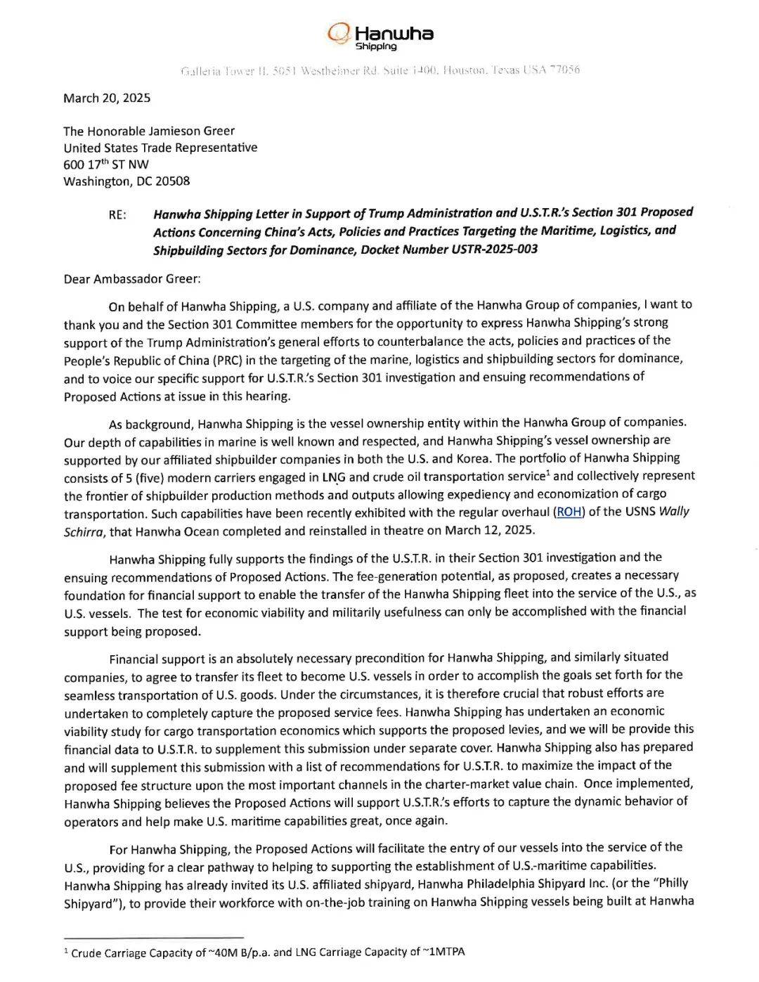 根据信德海事网了解,2025年3月20日,Hanwha Shipping曾致信美国贸易代表办公室(USTR)(收件人为Ambassador Jamieson Greer),在该封信件中,这家韩国企业明确表示支持特朗普政府与USTR就针对中国海事、物流与造船业的301拟议行动。