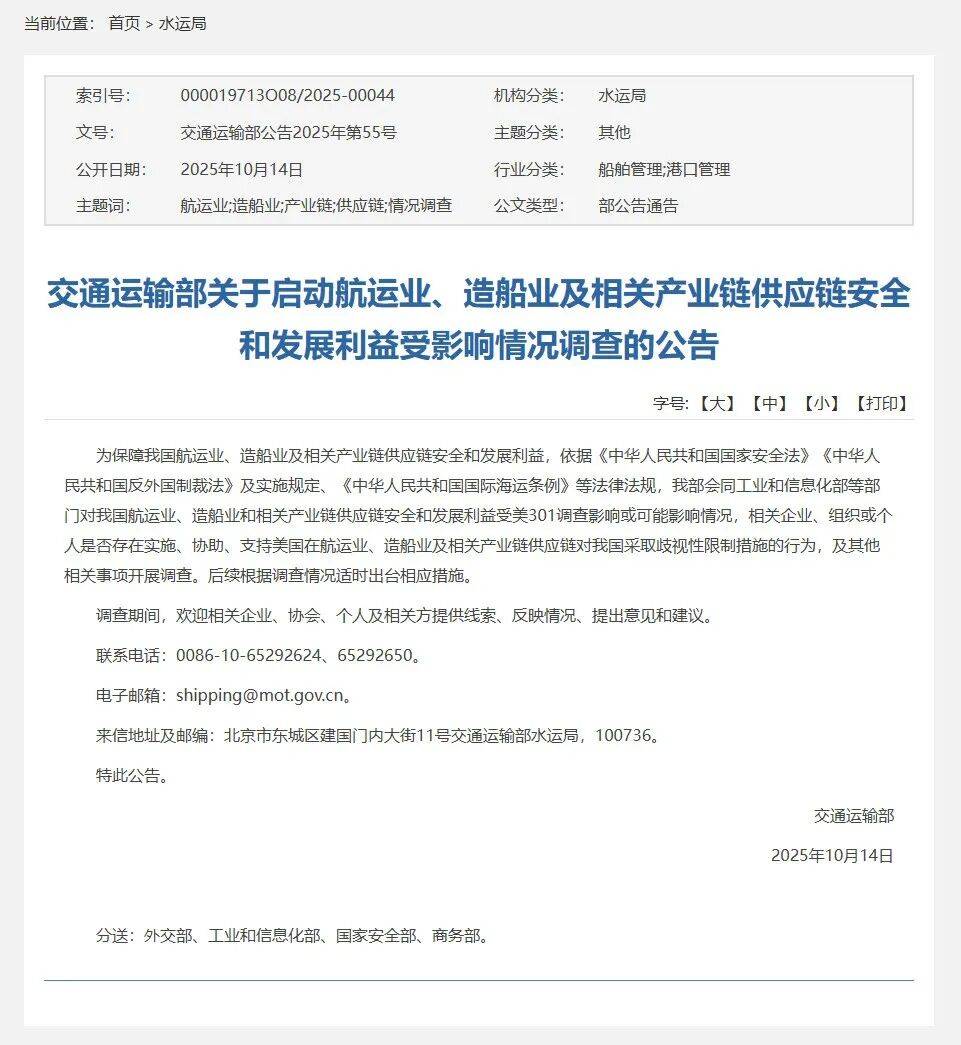 交通运输部关于启动航运业、造船业及相关产业链供应链安全和发展利益受影响情况调查的公告
