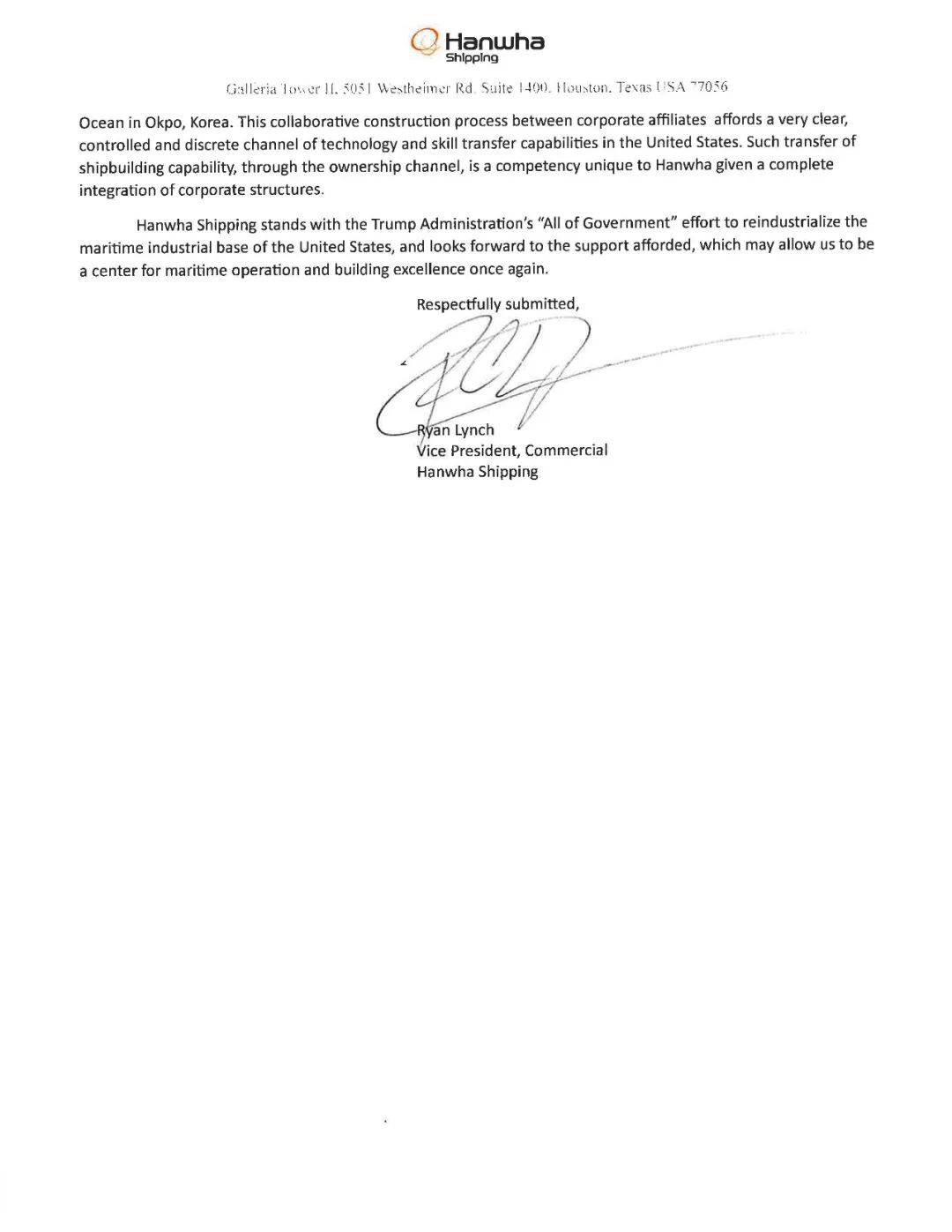 函件称,USTR拟议的收费(fee-generation)安排可为将 Hanwha Shipping 舰队转入美国服务(作为“U.S. vessels”)提供必要的财政基础;并称只有在获得上述财政支持的情况下,才能实现经济可行性与军事用途方面的检验。