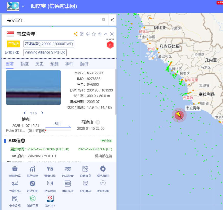 2025 年 12 月 2 日,随着韦立国际集团旗下 20 万吨级散货船 MV WINNING YOUTH 轮缓缓离开几内亚马瑞巴亚港锚地,满载 20 万吨高品位西芒杜铁矿石驶向中国,全球最受关注的矿业项目之一——几内亚西芒杜铁矿,正式完成了投产后的首次海上出口。