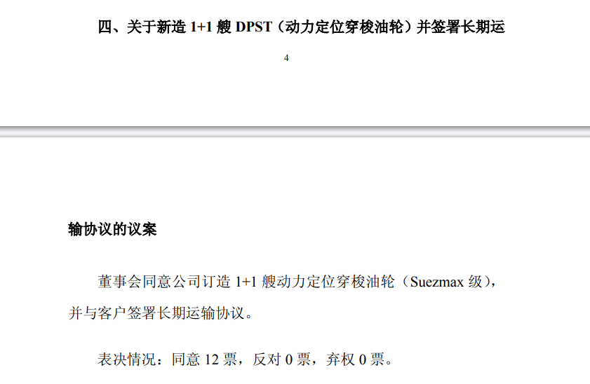 董事会决议:同意订造1+1艘DPST,并签署长期运输协议
