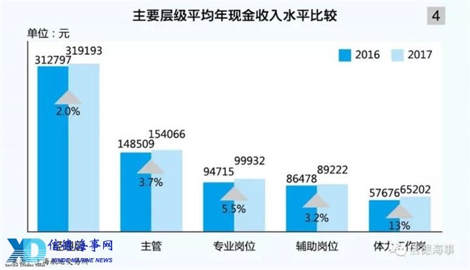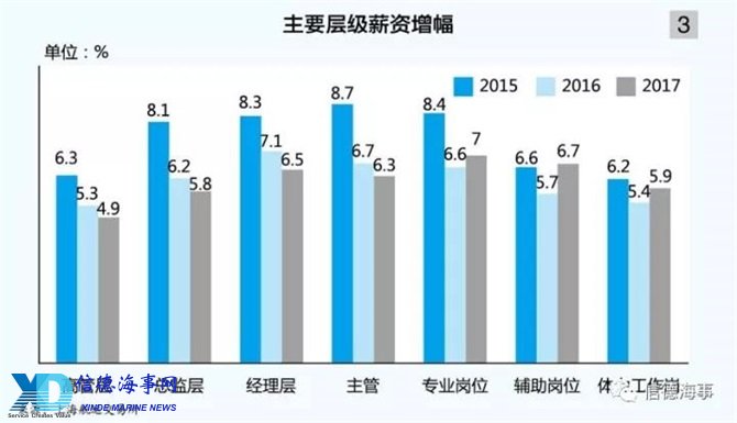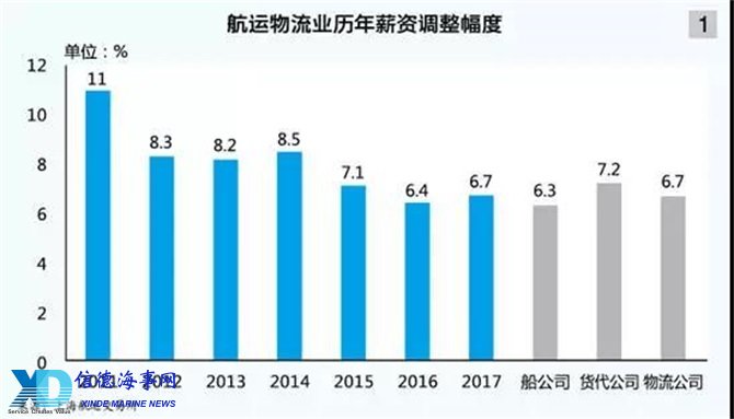2017年是航运业触底回升的一年,航运市场呈现明显复苏态势。与此相对应,2017年度航运物流行业平均薪资调整幅度约为6.7%,比2016年提高0.3个百分点,显示出整体市场的回暖态势。