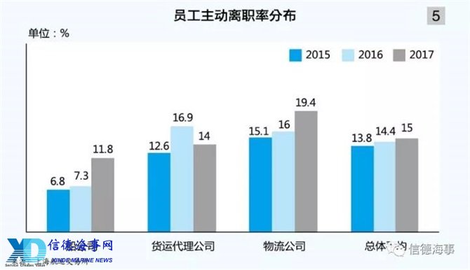 《薪酬调研报告》显示,2015—2017年连续三年的员工主动离职率基本维持在15%上下,波动不大,其中2015年主动离职率为13.8%,2016年主动离职率为14.4%,2017年主动离职率为15%。从三个细分行业来看,船公司和物流公司2017年的员工主动离职率均有不同程度提高,而货运代理公司的员工主动离职率则有回落。从连续三年的比率来看,2015年物流公司员工主动离职率最高,为15.1%,高于船公司的6.8%和货运代理公司的12.6%;2016年货运代理公司员工离职率最高,为16.9%,高于船公司的7.3%和物流公司的16.0%;2017年物流公司员工主动离职率最高,为19.4%,高于船公司的11.8%和货运代理公司的14.0%。(见图5)