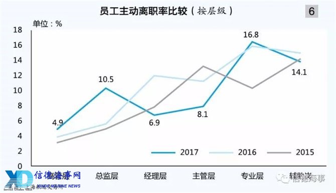从岗位层次来看,专业层职位、辅助层职位的员工主动离职率一直维持在比较高的水平,其中,专业层的员工主动离职率为16.8%,辅助层的员工主动离职率为14.1%。(见图6)