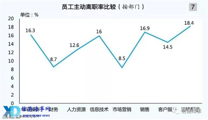 从细分部门的员工稳定性来看,2017年主动离职率最高的四个部门为运输配送、销售、单证操作和信息技术,主动离职率均超过16%。具体而言,单证操作为16.3%,财务为8.7%,人力资源为12.6%,信息技术为16.0%,市场营销为8.5%,销售为16.9%,客户服务为14.5%,运输配送为18.4%。(见图7)
