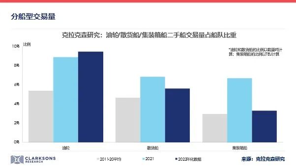 油轮:2022年油轮运费市场反弹,相关船东二手船投资兴趣增加,全球油轮二手船交易活动仍然强劲。年初至今,全球油轮二手船交易量已超过 390 艘合 3,800 万载重吨的油轮,与 2021 年同期的交易量相近。与此同时,油轮二手船年化交易量以载重吨计相当于年初时油轮船队的 9.4%,远高于 2011-20 年 5.4% 的平均值。