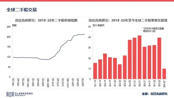 全球二手船交易量在2021年创下克拉克森研究记录的二手船交易量的最高记录,达2,479艘合1.4亿载重吨。2022年至今,全球二手船交易量延续强劲表现。与此同时,克拉克森二手船价格指数较上涨至213.3,较2021年初涨幅达115%。