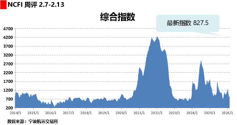本周,宁波航运交易所(www.nbse.net.cn)发布的海上丝绸之路指数(简称“海上丝路指数”,www.msri.cn)之宁波出口集装箱运价指数(NCFI)报收于827.5点,较上周基本持平。21条航线中有9条航线运价指数上涨,10条航线运价指数下跌,2条航线运价指数基本持平。“海上丝绸之路”沿线地区主要港口中,12个港口运价指数上涨,4个港口运价指数下跌。
