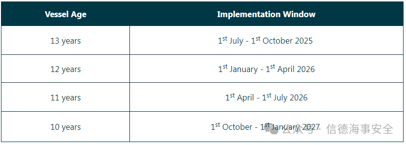 经修订后的时间表,修改后,由2个阶段改为4个阶段,最终开展10年船龄以上船舶检查时间点从2026年3月31日推迟至2027年1月1日。凭借延长的四阶段推行方式,为船东和船舶管理公司(O&Ms)预留了更为充裕的时间,以便其适应全新的检查要求。如此一来,船东和船舶管理公司(O&Ms)便能有时间调整预算、安排船员培训并为船舶检查做好充分筹备,同时又不会对运营效率造成任何干扰。