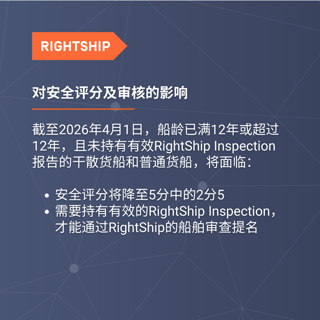 自2026年4月1日起,船龄在12年及以上的干散货船和普通货船必须持有有效的RightShip Inspection报告。
