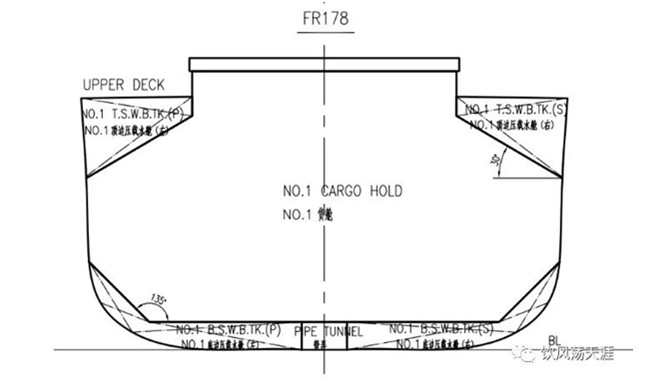(2)中垂虽然会导致装货量减少,但不必过度追求“0中垂”,因为根据之前的平均水尺计算公式可知,一旦出现中拱,那在限制吃水下,为了不让首尾吃水超限,中拱值每增加1cm,装货量将减少TPC,这岂止是过犹不及,简直是得不偿失。另外,绝大多数散货船都属于尾机型,空载航行时基本呈中拱状态,满载则出现中垂。如果在满载时就出现中拱,将极大可能导致船舶在卸货过程中及卸空后出现比正常情况下更大的中拱值,将大大有损于船体强度。且一般来说,普通散货船通常不会在空载时利用压载水的调节来减小中拱(如压载风暴舱或减少船舶首、尾端的压载水量),因为压载风暴舱的目的通常是为了在大风浪海域航行时增加船舶吃水,提高其抗风浪能力。且为了避免自由液面影响,须压满整个舱,压水量巨大。而通常海况下的风暴舱压载除了平白使其两端横舱壁遭受极大剪切应力而增加金属疲劳外,还会增大船舶载重,进而增加油耗,降低经济效益。减少首、尾端压载水量则在导致船舶整体吃水减小,降低抗风浪能力的同时,还可能增加船艏视野盲区,或者致使螺旋桨沉深不足,且会于半载压载水舱内形成自由液面,不利于船舶安全航行。