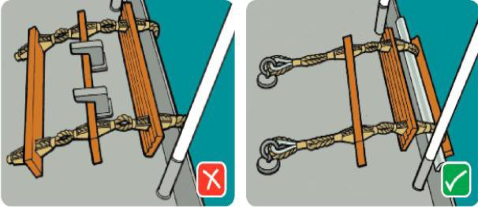 8、踏板固定块脱落导致上下踏板倾斜,或船员自行更换引水梯踏板、边绳及其他部件, 导致尺寸、间距、系固程度等不符合要求。