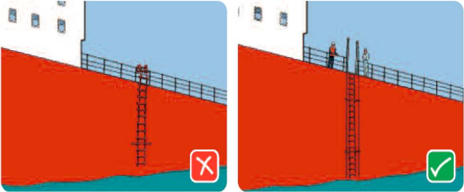 10、关注引水梯布设在水尺、载重线等突出部位附近时,由于梯子移动,边绳有被突出部位割断风险。