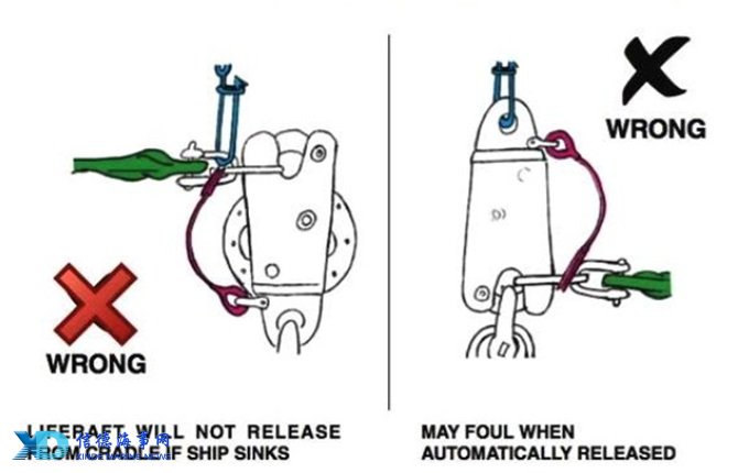 这两张照片,一张是整改前的,一张是整改后的,很明显,错误的连接,是当释放器释放后,救生筏和首缆将同时脱开筏架,救生筏无法被充气膨胀打开。