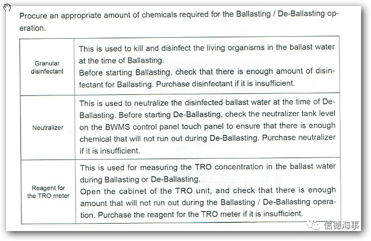 是的,化学品不少是有毒的,更何况是用于给压载水消毒除菌的呢?安全永为最高关注,所以说明书的最开头就讲到了 safety precautions。上边的话如果你觉得太装X,太虚,太假,回归实际一点的,下边的就实际多了,是更多人愿意关心的问题-----------压载水处理系统的化学品,下一节