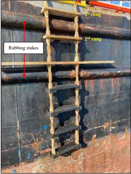 调查组还考虑了另一种情况,即在下梯子时,船长可能无意中踩到了圆柱状的的防磨条rubbing strake,该rubbing strake从船体突出约8厘米。据观察,尽管引水梯固定牢靠,但由于rubbing strake挡在船侧,这也可能导致绊倒危险。然而,对引水梯的仔细检查排除了这种情况。这似乎不太可能,因为rubbing strake和第一个梯凳之间的距离太窄,船长不会意外地把脚放在rubbing strake而不是梯凳上。
