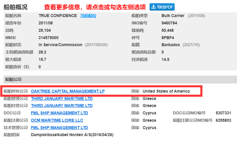 虽然根据以上该轮船东和船管的联合声明,该船与美国无关联。但根据船讯网为信德海事网提供的该轮的资料显示,该轮的确为美国投资公司橡树资本OAKTREE CAPITAL旗下拥有的船舶。