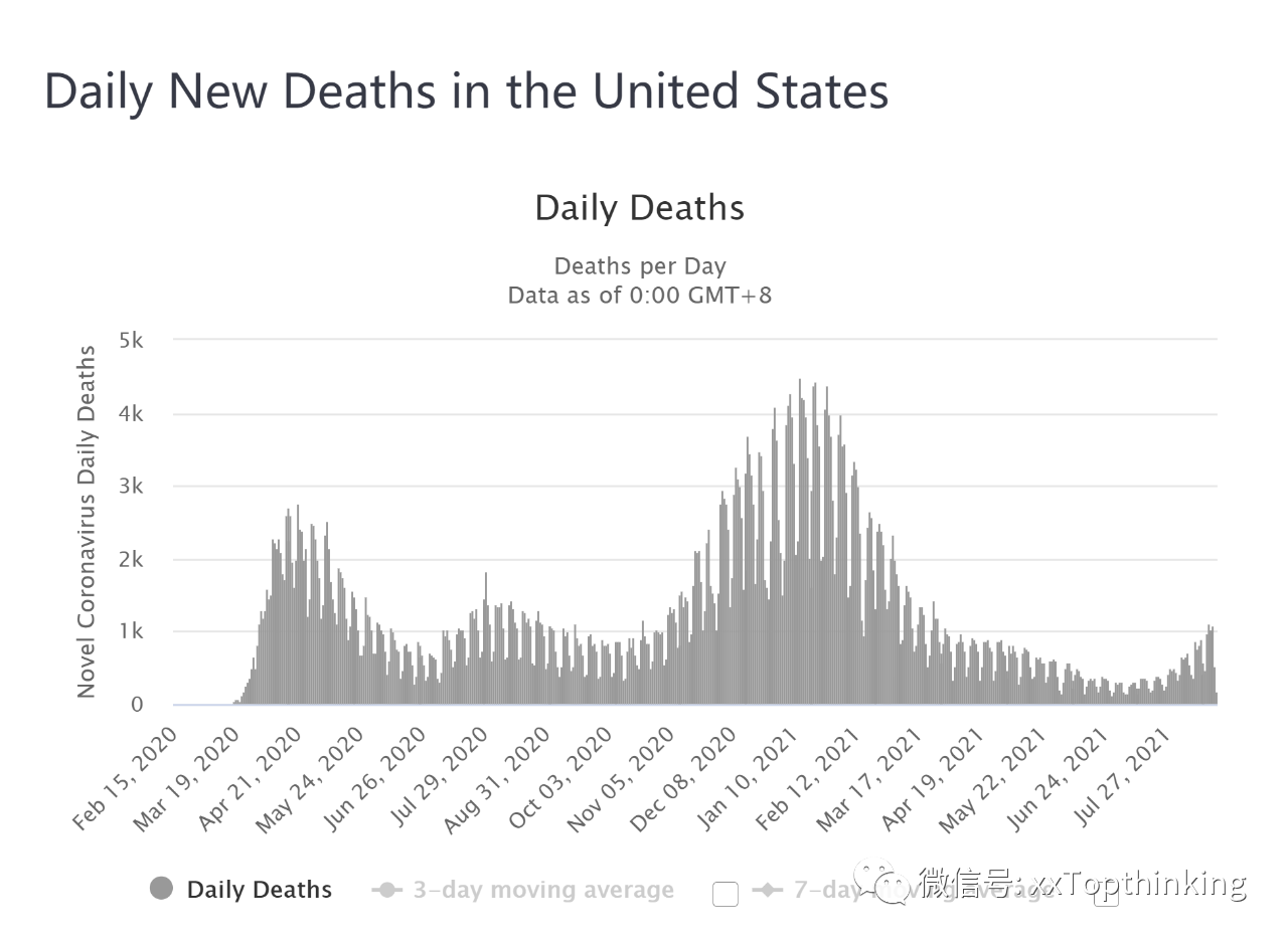 邮轮的最大客源国为美国,目前每日新增病例大概在16000人,每日死亡人数约为1100人,以死亡人数除以新增病例,得出不太严谨的死亡率为6.9%(只是作比较用,可能与医学所定义的死亡率有差异)。可以看到,美国疫情自7月中旬以来又形成了一波上升的势头,而且死亡人数也在抬头,只不过死亡人数大大低于上一波疫情(最高点达到每日4000人左右)。