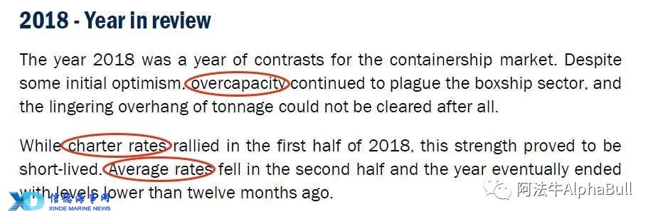 ② OVERCAPACITY:很多航运媒体把overcapacity翻译成“产能过剩”,我觉得不很准确,应该翻译成“运力过剩”更加确切。所谓“产能”,即“生产能力”的缩写。对于制造业来说,通常以每年能生产多少数量的产品来衡量,比如某汽车制造厂的产能为每年1000万辆汽车等等。但是航运业没有实物形态的产品,它生产的是货物位置的转移,以运量(吨,TEU/年)来计算。