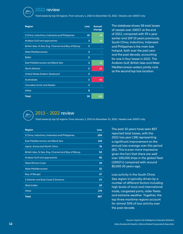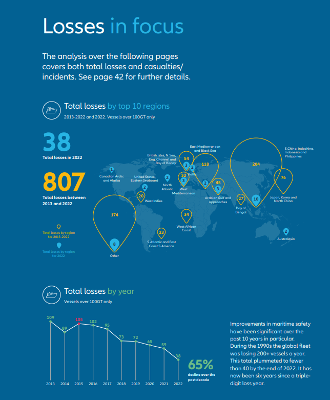 损失和伤亡统计的主要数据来源是劳氏船级社相关数据统计(数据截止日期:2023年3月31日)。损失是指在分析时记录的100总吨或以上船舶(不包括游艇和小型船舶)的实际损失或推定损失。