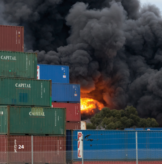 最近发生的火灾事故有,2022年8月发生的ZIM Charleston轮火灾事故,约有300个集装箱受损。随后,2022年10月发生在红海的TSS Pearl号火灾事故,船员被迫弃船,船舶随后沉没。港口和仓库也发生了几起火灾,包括2022年孟加拉国吉大港一个集装箱仓库发生的火灾和爆炸,造成40人死亡。